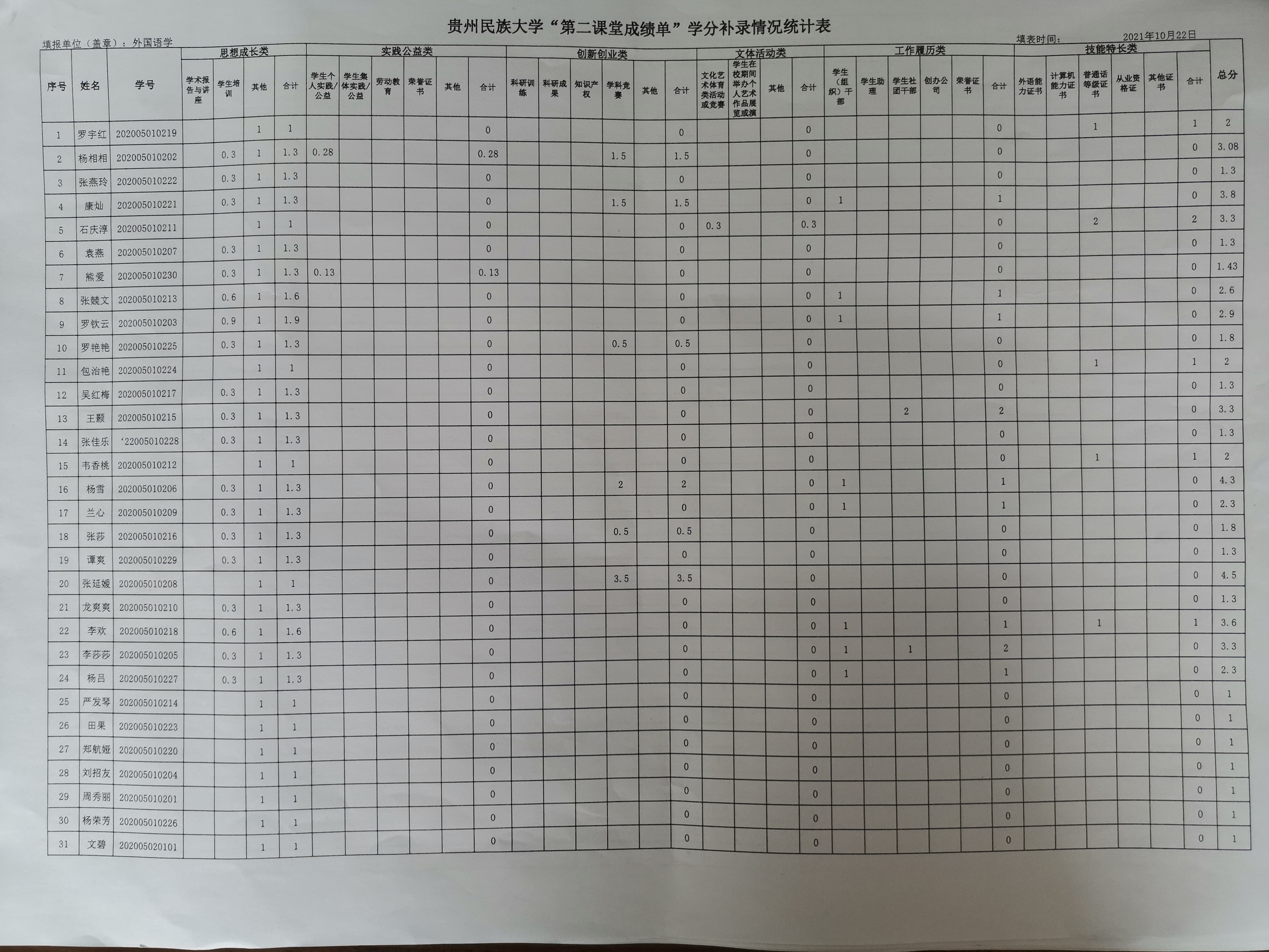 为进一步贯彻落实《教育部关于加快建设高水平本科教育全面提高人才培养能力的意见》(教高〔2018〕2号)文件、《高校共青团改革实施方案》和《关于全面加强新时代大中小学劳动教育的意见》精神,根据《贵州民族大学“第二课堂成绩单”制度实施办法》,现将欧冠联赛联赛竞猜2020级学生“第二课堂成绩单”补录学分公示如下: