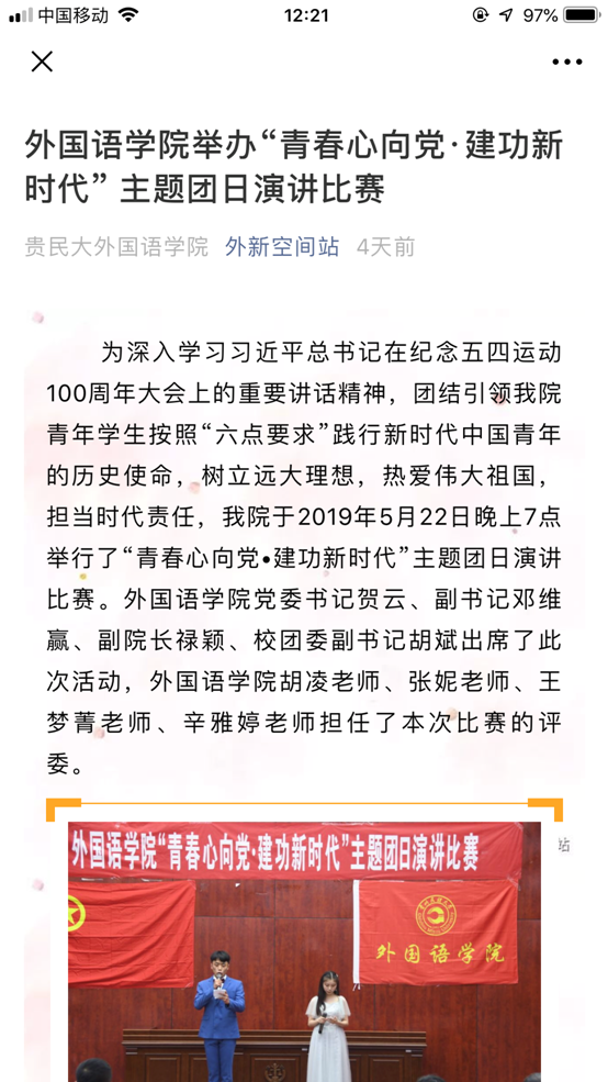 为了进一步学习贯彻落实习近平总书记在纪念五四运动100周年大会上的重要讲话精神,强化青年团员对“六点要求”的认识,我院于2019年5月22日晚上7点举行了“青春心向党•建功新时代”主题团日演讲比赛。欧冠联赛联赛竞猜党委书记贺云、副书记邓维赢、副院长禄颖、校团委副书记胡斌出席了此次活动,由欧冠联赛联赛竞猜胡凌老师、张妮老师、王梦菁老师、辛雅婷老师担任了本次比赛的评委。