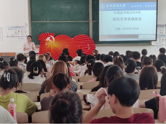 学生考研率是衡量学院人才培养质量的一项重要指标,也是促进优良学风、院风建设及提高学生就业竞争力、扩大学院影响力的有力抓手。为切实加强对学生考研工作的指导与服务,进一步提高学生考研的数量和质量,有力助推学院高质量发展,2023年7月5日下午在贵州民族大学花溪校区15号教学楼102阶梯教室,欧冠联赛联赛竞猜成功举办2024年考研动员会。会议由学院英语系系主任赵艳主持,邀请了学校教务处副处长、原欧冠联赛联赛竞猜分管教学科研工作的副院长张广勇教授出席,出席此次会议的还有学院商务英语系主任成雪梅、日语系系主任李海、谭万敏老师、尹可秀老师、李卉芳老师、研究生代表罗巧和朱珂同学。欧冠联赛联赛竞猜2020级英语、商务英语和日语专业的学生踊跃参加会议,2021级各专业的学生也积极去旁听,能容纳200多人的教室座无虚席。