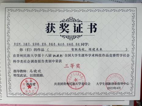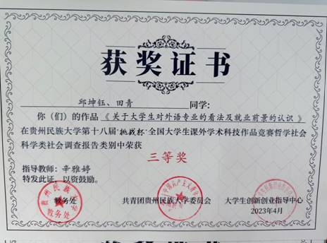 欧冠联赛联赛竞猜共28个项目,其中,由辛雅婷老师指导,邱坤钰、田青同学创作的《关于大学生对外语专业的看法及就业前景的认识》以及由马晓欢老师指导,李宜珂等同学创作的《智联高校,绿建未来》2个作品在社会调查报告类中均荣获三等奖。特此祝贺!