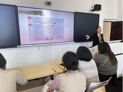 此次教研活动精彩纷呈,四位教师分别围绕不同的课文单元主题对教学技能进行了示范性讲授。田甜老师对《幸福》主题单元的教学设计注重“两性一度”,同时深挖课程思政元素,帮助学生树立正确的价值观。杜晖老师以培养学生翻译能力为教学核心,通过精心设计的教学活动,让学生在诙谐幽默的课堂氛围中习得翻译技巧。龚坤老师全英文讲解《垃圾岛》,对环保理念作了生动的课堂教学展示。郭秋玉老师则以《基于全人教育理念的教学创新与实践》为主题,完整地阐述了大学英语教学改革与创新的成效。她们凭借扎实的教学功底、独特的教学风格以及丰富多样的教学手段,赢得了在场同事的阵阵掌声。
