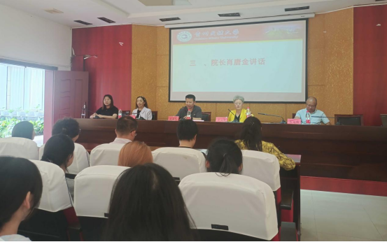 接下来肖唐金院长结合自己的亲身经历为学生们介绍了学校的历史底蕴和学院的发展历程。肖院长强调了外语教学的重要性,并告诫同学们要积极培养听说读写译等微技能,学习要讲究方式方法,合作学习提高学习效率。