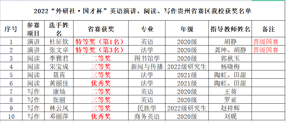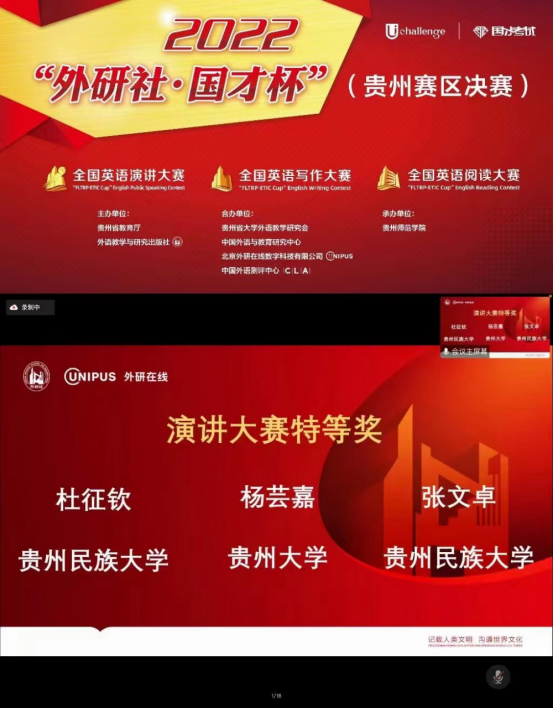 “外研社·国才杯”英语演讲、写作、阅读比赛是外语类被列入中国高等教育学会高校竞赛排行榜首位的大赛。贵州省赛区决赛于2022年11月5日在贵州师范学院举行,贵州民族大学选手在欧冠联赛联赛竞猜教师的指导下表现不俗,取得成绩如下: