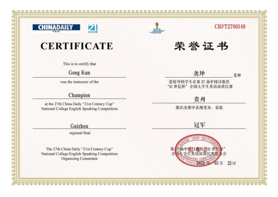 全国高校数万名选手报名参加本届大赛,29个赛区共有500余名优秀选手参加地区决赛。在欧冠联赛联赛竞猜的认真组织下,来自法学院2020级法学专业张文卓同学,通过欧冠联赛联赛竞猜龚坤老师的悉心指导,从“21 世纪杯”全国英语演讲比赛贵州赛区的三轮选拔中脱颖而出,勇夺贵州省级决赛冠军,成功晋级全国总决赛!!!