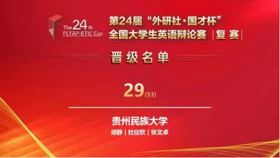 欧冠联赛联赛竞猜2020级英语专业杜征钦同学和法学院2020级法学专业的张文卓同学,在欧冠联赛联赛竞猜胡静老师的悉心指导下,在华南地区复赛中,经过4月16日和17日两天五轮的激烈比拼,荣获三等奖,成功晋级第24届“外研社·国才杯”全国大学生英语辩论赛全国总决赛,使贵州民族大学成为贵州省唯一获得晋级全国总决赛的高校。