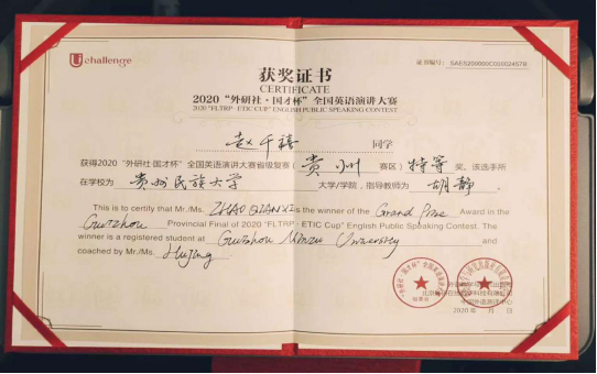 经过激烈的角逐,我校参赛选手取得了优异的成绩:胡静老师指导的文学院2017级赵千禧同学以第一名的好成绩取得演讲比赛特等奖,获得在北京参加全国决赛的资格;张田田老师指导的欧冠联赛联赛竞猜2017级肖艳玲同学取得写作比赛一等奖;张田田老师指导的欧冠联赛联赛竞猜2017级李林飞同学取得阅读比赛二等奖;陶玮老师指导的数据科学与信息工程学院2018级祁星威同学、郭瑶老师指导的2020级研究生苏浩辀同学获得写作比赛三等奖;郭瑶老师指导的数据科学与信息工程学院2020级研究生苏浩辀同学、张田田老师指导的欧冠联赛联赛竞猜2017级史登艳同学获得阅读比赛三等奖。