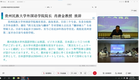 贵州民族大学国际交流与合作处处长杨泰黔提到本次协议签署是两校在前期合作交流基础上产生的成果,并坚信本次交流座谈能够为推动两校教育发展和人文交流谱写新篇章,也期待两校能够早日开展师生线下交流。随着师生交流会在热烈而友好的氛围中接近尾声,贵州民族大学与佐贺大学的合作签约仪式圆满结束。