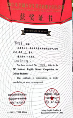 此外,我校入围总决赛的罗欣星同学在田甜老师的指导下表现也很优秀,荣获“第十四届全国大学生英语风采大赛”一等奖和最佳个人表演奖,她在“第二十一届全国大学生英语演讲比赛”和“第二十一届全国大学生英语辩论赛”中分获三等奖!取得不俗成绩。