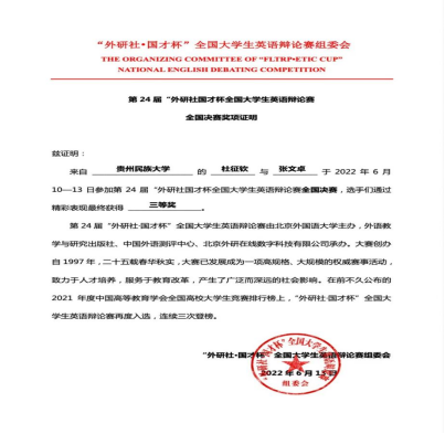 2022年6月13日,我校2020级法学专业的张文卓同学和2020级英语专业的杜征钦同学,在欧冠联赛联赛竞猜胡静老师的悉心指导下,经过3天8轮的激烈比拼,在第24届“外研社·国才杯”全国大学生英语辩论赛中荣获国家级三等奖,贵州民族大学成为贵州省唯一晋级全国总决赛并荣获国奖的高校。