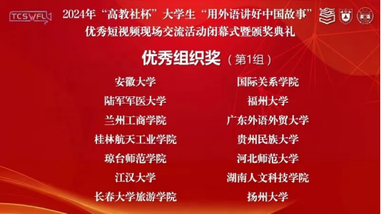 9月27-29日,由中国英汉语比较研究会指导,南京大学、湖南大学主办,高等教育出版社协办的2024年“高教社杯”大学生“用外语讲好中国故事”优秀短视频现场交流活动在湖南大学举办。我校入围的谢晓萌团队及其成员潘洲颖、田明涛、马俊(传媒学院),由赵艳副院长带队,代表贵州参与此赛事的全国决赛,最终获得全国一等奖。该团队由欧冠联赛联赛竞猜副院长赵艳和英语系主任牛敏两位老师共同指导。这是我院自2023年以来在该赛事上连续两年荣获全国一等奖。贵州民族大学成为贵州省唯一晋级此赛事全国交流活动并荣获国奖的高校。