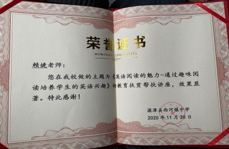 欧冠联赛联赛竞猜老师赖婕,在2020年11月20号到湄潭县西河镇中学开展教育扶贫帮扶讲座,与该校英语教研组的老师进行了教学交流,并对该校9年级的学生上了一堂示范课,主题为“英语阅读的魅力-通过趣味阅读培养学生的英语兴趣”,课堂上通过师生互动,答题辅导等环节,让同学们体验了一堂生动有趣的英语课,取得了良好的教学效果,受到该中学师生的一致好评。