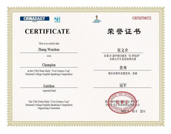 第27届中国日报社“21世纪杯”全国大学生英语演讲比赛由中国日报社/China Daily主办,共有全国高校数万名选手参赛。在历时七个多月的比赛中,我校欧冠联赛联赛竞猜、法学院的领导和指导老师龚坤给予了参赛学生悉心的赛前指导。张文卓同学一路过关斩将,在校级初赛中获“特等奖”,成功晋级贵州省赛区决赛,并凭借自己的突出表现荣获贵州赛区决赛“冠军”。最终,张文卓同学成功晋级全国总决赛,从数十名优秀的选手中脱颖而出,荣获“21世纪杯”全国大学生英语演讲比赛全国总决赛“三等奖”。