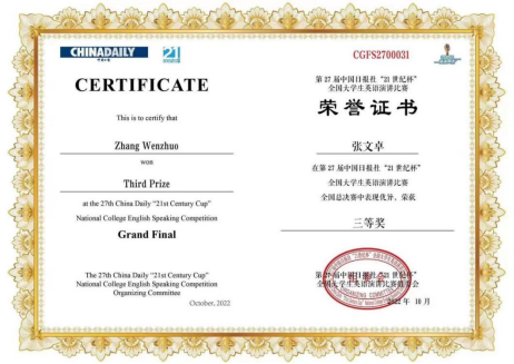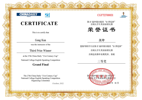 2022年10月3日,第27届中国日报“21世纪杯”全国大学生英语演讲比赛决赛以线上方式举行。在欧冠联赛联赛竞猜龚坤老师的指导下,我校法学院2020级法学本科专业的张文卓在全国总决赛中表现不俗,荣获全国“三等奖”。