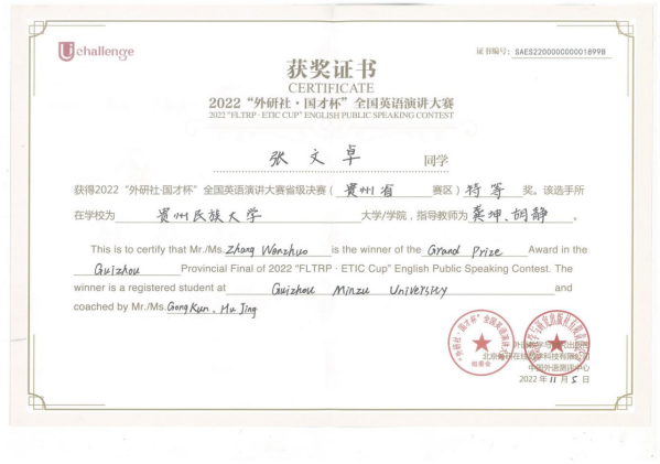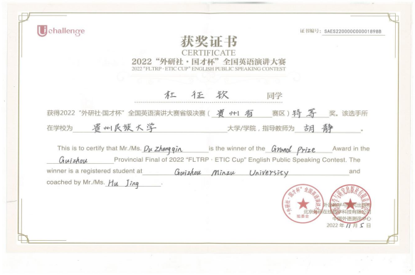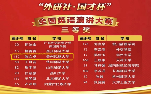 2022年11月5日“外研社·国才杯”英语演讲大赛贵州省赛区决赛在贵州师范学院举行,贵州民族大学选手在欧冠联赛联赛竞猜教师胡静、龚坤的指导下喜获佳绩:杜征钦和张文卓从49名决赛选手中脱颖而出,摘取冠军和季军,均获省级特等奖,成功晋级全国总决赛!